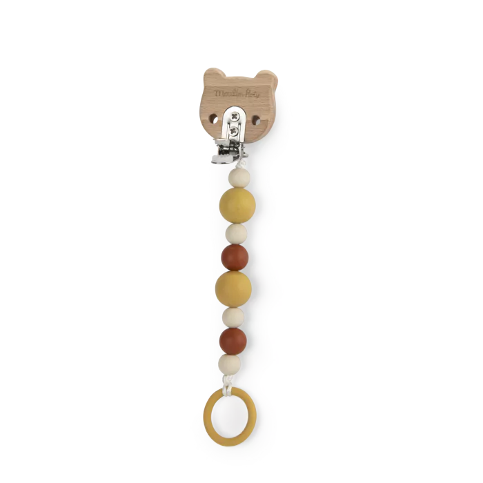 Κλιπ πιπίλας τύπου τίγρης από ξύλο και σιλικόνη για να διατηρείτε την πιπίλα του μωρού σας ασφαλή. Το ρυθμιζόμενο κλιπ της σάς επιτρέπει να την στερεώνετε σε οποιαδήποτε επιφάνεια. Οι χάντρες σιλικόνης είναι ασφαλείς για να παίζουν και να μασούν τα παιδιά χωρίς να ανησυχούν.