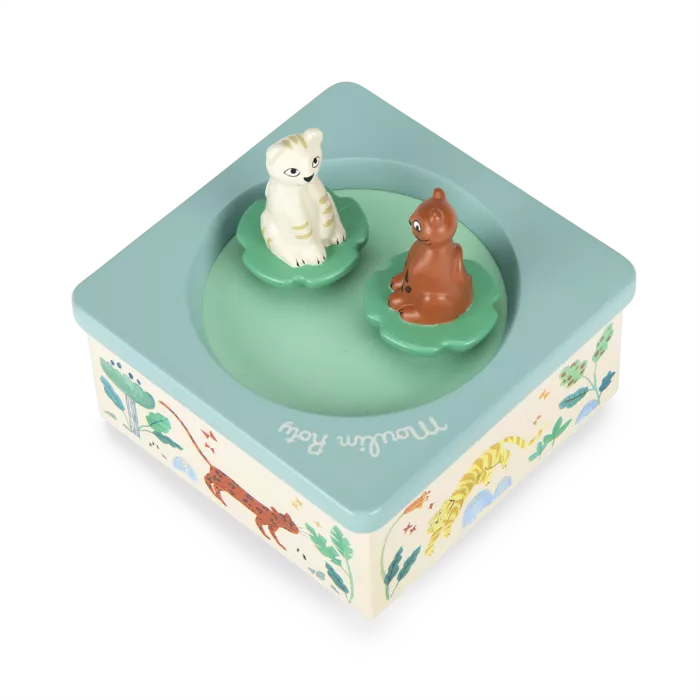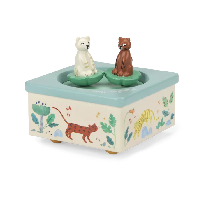 Ο Μπαμπού και ο Τάιγκο στροβιλίζονται στον ρυθμό του νανουρίσματος για να νανουρίσουν απαλά το παιδί σας. Το μουσικό κουτί έχει εικονογραφηθεί όμορφα με ακουαρέλα από την Élodie Coudray.