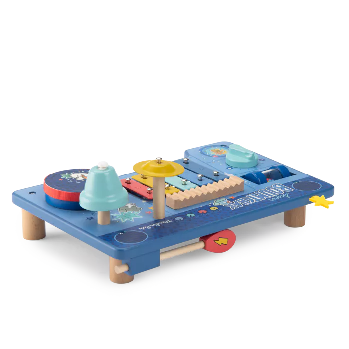 Το σούπερ τραπέζι τυμπάνων της Puce & Pilou έφτασε! Χτυπήστε το τύμπανο, δυναμώστε την ένταση, κουνήστε τις χάντρες, χτυπήστε το κύμβαλο… Πληθώρα δραστηριοτήτων για να ανακαλύψει το μωρό. Φτιαγμένο από ξύλο και εικονογραφημένο, αυτό το μουσικό τραπέζι είναι εύκολα φορητό.