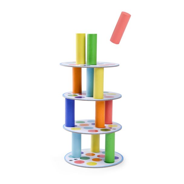 Φτιάξτε τον ψηλότερο δυνατό πύργο. Προσθέστε εναλλάξ τους κυλίνδρους σύμφωνα με το χρώμα που υποδεικνύεται από τη βάση στις στρογγυλές σανίδες, αποτρέποντας παράλληλα την πτώση του πύργου. Παιχνίδι από τη συλλογή Les Loufoques. 2 παίκτες ή και περισσότεροι. 4 ετών και άνω