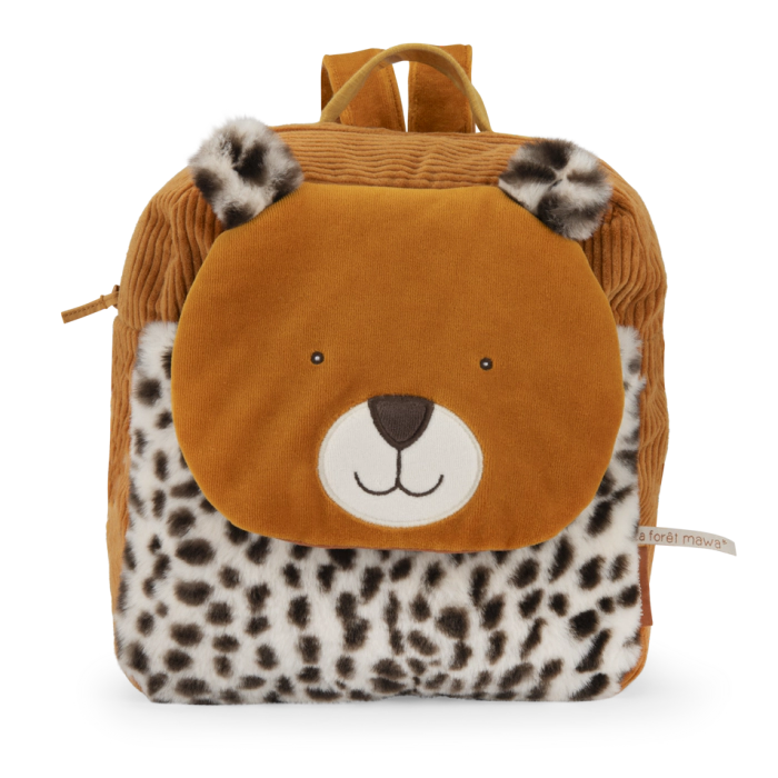 Φτιαγμένο από κοτλέ και γούνα, το Taïgo, η λεοπάρδαλη, μεταμορφώνεται σε ένα πρακτικό σακίδιο πλάτης χάρη στην μπροστινή τσέπη με μπάλωμα, το κλείσιμο με φερμουάρ και τα ρυθμιζόμενα λουράκια. Εξοπλισμένο με γάντζο για το παλτό, είναι ιδανικό για τις πρώτες του βόλτες. Δυνατότητα κεντήματος.