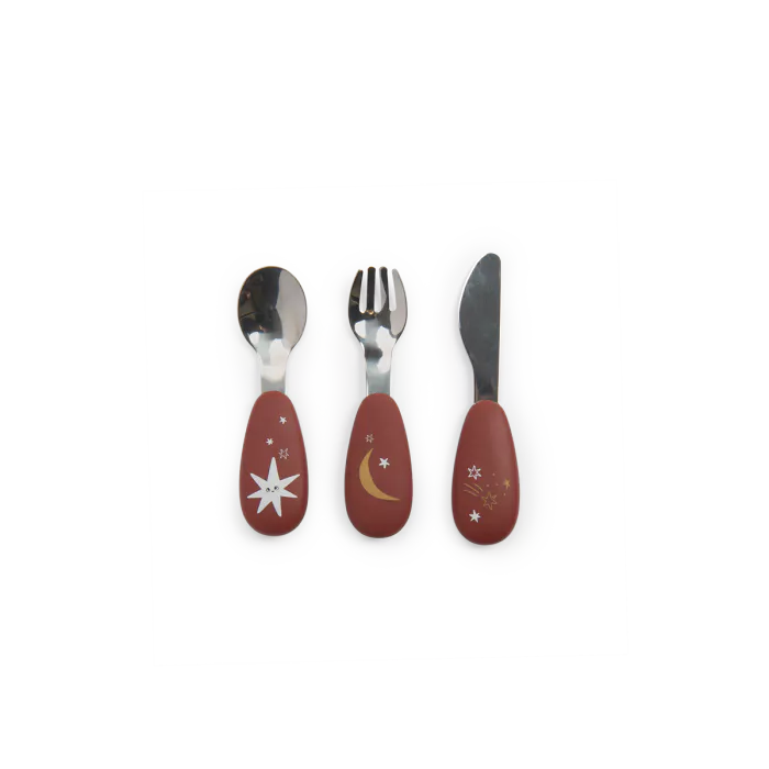 Ένα σετ 3 μαχαιροπήρουνων από ανοξείδωτο ατσάλι και σιλικόνη, σχεδιασμένο για άνετη λαβή και για να βοηθήσει τα παιδιά να τρώνε όπως οι μεγάλοι! Τα μαχαιροπήρουνα είναι όμορφα εικονογραφημένα με τις χρωματικές αποχρώσεις της συλλογής “Μετά τη βροχή”.
